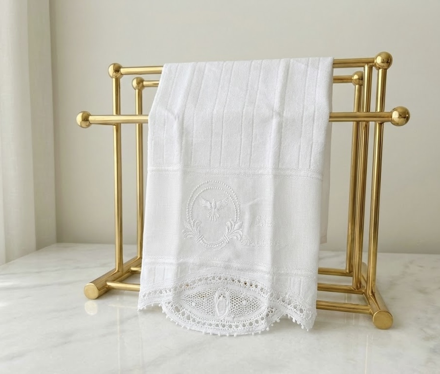 Toalha branca felpuda bordada para batizado com desenho do Espírito Santo, com barrado em renda renascença.