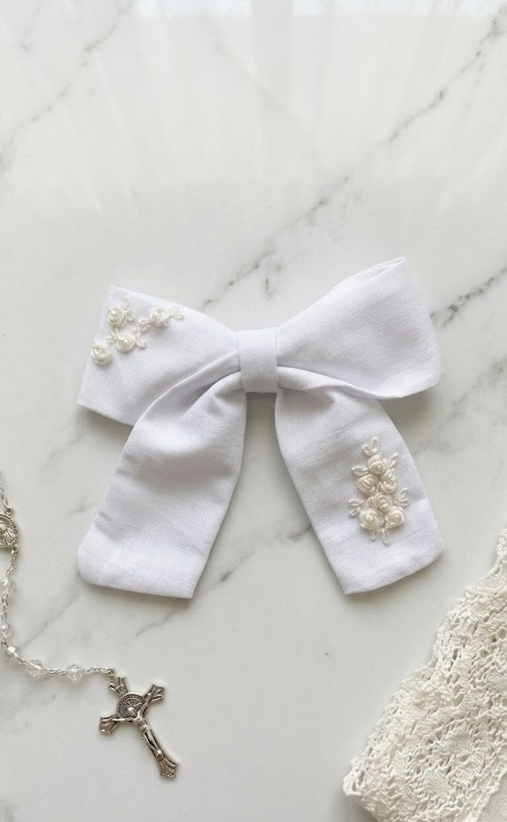 1 laço feito em tecido de algodão e bordado a mão com rosas brancas e aplicações de perolazinhas.