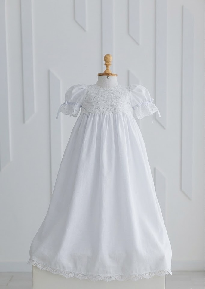 Nossos mandriões são uma combinação de tradicionalidade, sofisticação e conforto! Vestimos seu pedacinho de mundo como uma verdadeira boneca e este mandrião traduz aquilo que você está procurando, um toque de encanto e graciosidade. Esse mandrião tem busto frontal em renda renascença (inteiramente feita à mão) e mangas bufantes, reguláveis com fitilho em cetim, além de ter aplicação de bico em renda renascença na borda das mangas. O tecido em cambraia de algodão 100% no poá com renascença no barrado. Visando o conforto e o bem estar das nossas pequenininhas, nossos mandriões são forrados em tecido de algodão.