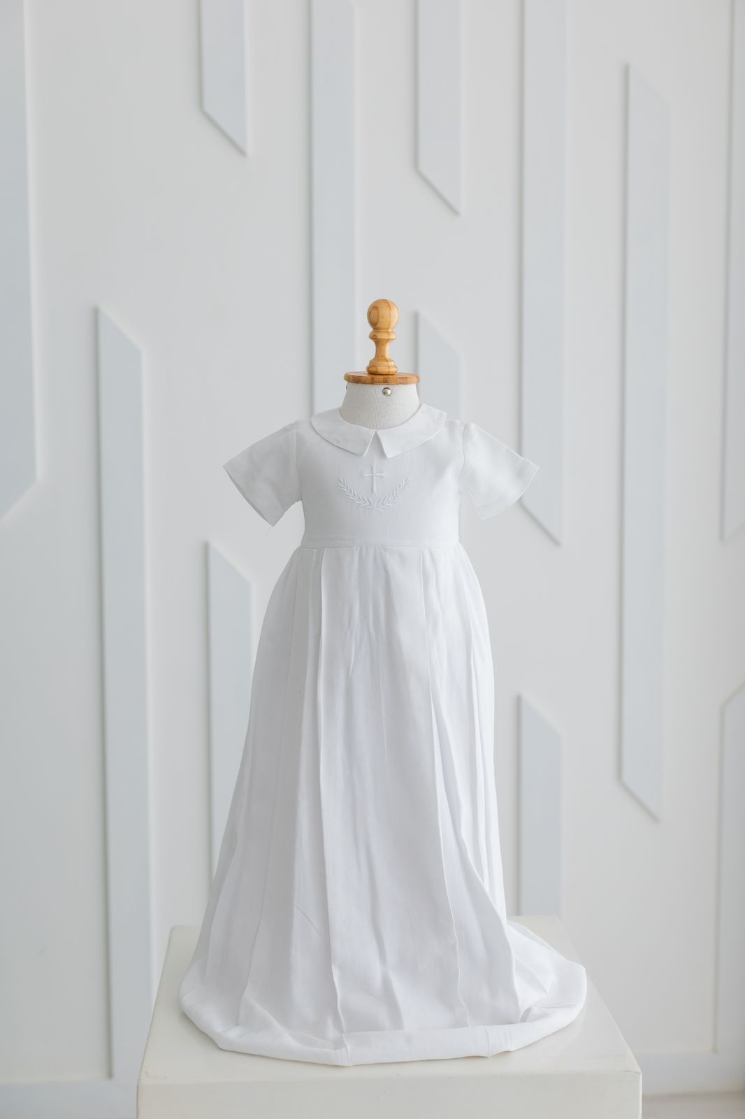 Mandrião Branco com gola padre e cruz bordada no peito - opção perfeita para Batizados clássicos e tradicionais! Em viscose e linho muito confortável e todo forrado em cambraia 100% algodão gerando ainda mais conforto para o seu bebê. Acompanha touca branca lisa.
