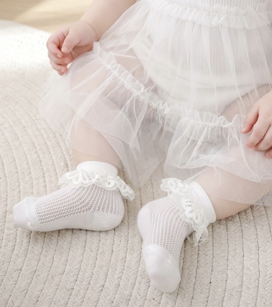 Meia branca curta com babadinhos em renda. Super delicada e charmosa, perfeita para ser usada em momentos especiais da sua bebê e compor looks com as nossas peças de batizado.