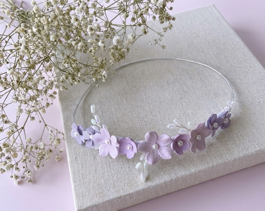 Tiara para batizado feita a mão em elástico prata com aplicações de flores lilás e pérolas. Possui proteção na parte interna para maior conforto da bebê. Perfeita para completar nossos vestidos .
