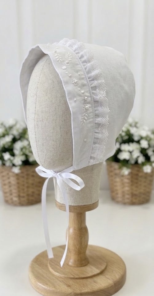 Touca batizado branca, tecido 100% algodão, com bordado floral e aplicação manual de pérolas, acabamento com viés e renda de algodão e fita de cetim para amarrar.