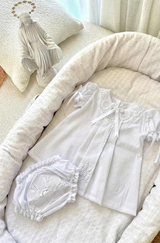 O Vestido Branco Trapézio em Renascença para bebês é confeccionado em cambraia 100% algodão, proporcionando conforto e leveza para a pele delicada dos pequenos. A peça possui detalhes em renda artesanal renascença e bordado manual que conferem exclusividade e sofisticação ao modelo. Acompanha uma calcinha com aplicação da mesma renda, garantindo um conjunto harmonioso e prático. Ideal para ocasiões especiais e batizados, este vestido une tradição e qualidade em uma obra de arte rara, que resiste ao tempo.