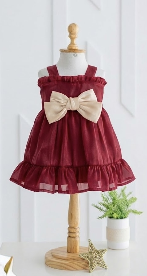 Vestido infantil vermelho marsala em organza cristal para festas, fotos de final de ano e momentos especiais. Possui laço creme removível na parte da frente. A saia possui e forro interno. Um luxo para festas e ensaios natalinos.