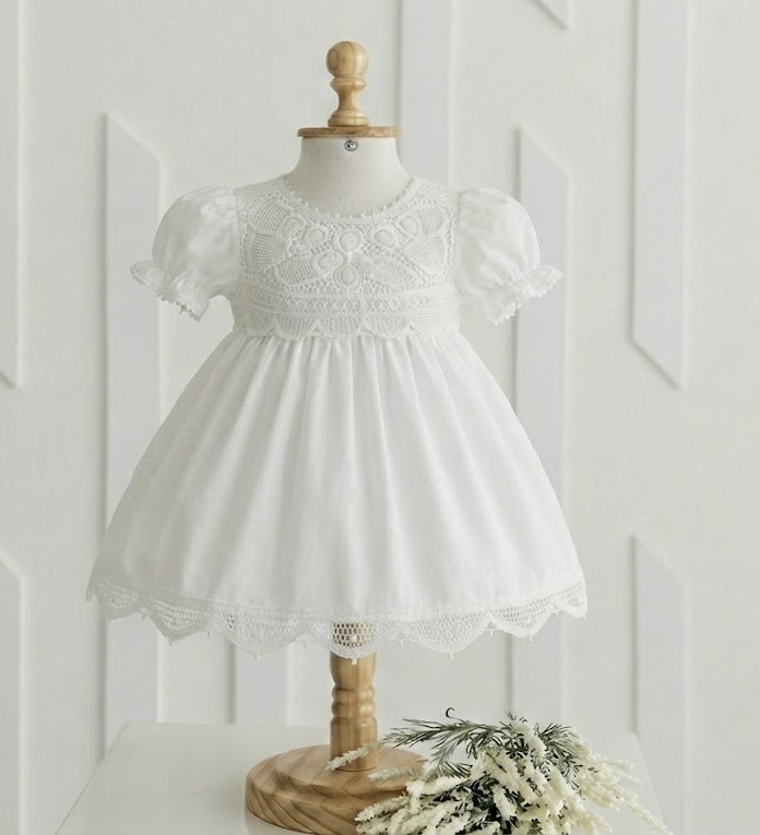Vestido Renascença Melissa com busto em renda artesanal renascença, fabricado em cambraia 100% algodão, ideal para bebês. Possui uma pala detalhada em renascença feita à mão, com mangas bufantes ajustáveis por fitilhos que asseguram conforto e estilo. O barrado apresenta um acabamento em bico renascença, enriquecendo o visual delicado do vestido que inclui forro para maior conforto da criança. Essa peça é perfeita para batizados e ocasiões especiais, unindo tradição e sofisticação em um tecido leve e respirável.