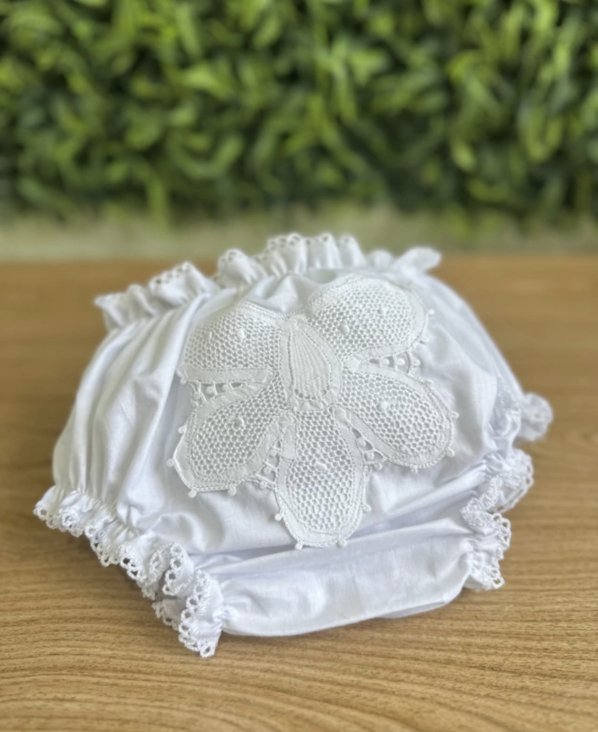 Calcinha bunda rica em cambraia de algodão, com aplicação flor em renda renascença.